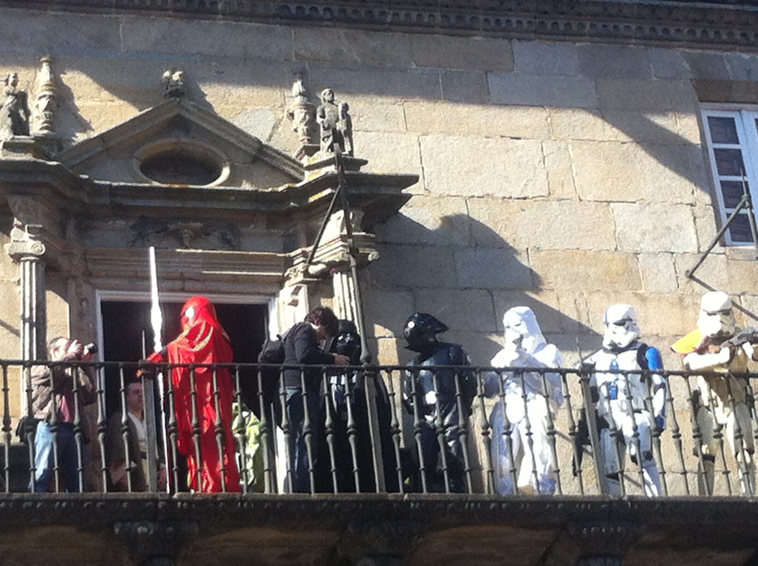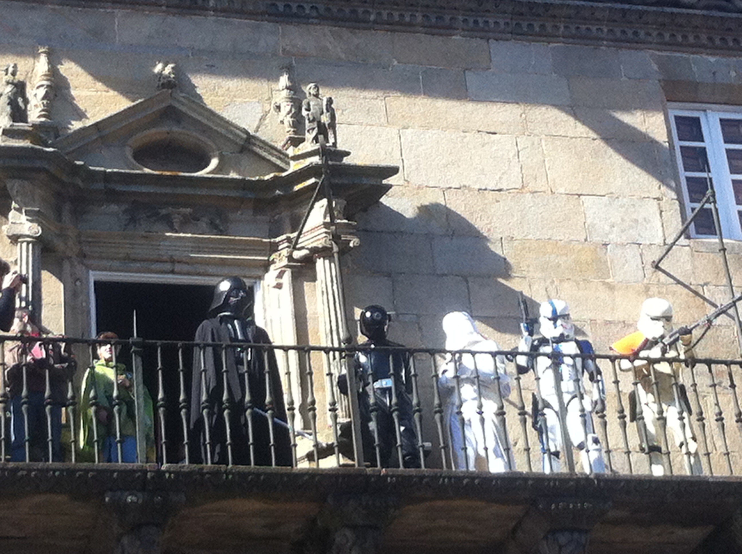 It was such a beautiful day today weather-wise. Light breezes, clear blue skies and sunny all throughout. I sat outside by myself in front of the cathedral for a while and just people-watch. Marybel was taking a nap in the hostal. The cathedral is next to the Hotel Parador Santiago which is reputed to be the oldest hotel in Spain. We will visit the Parador for breakfast tommorrow morning. While sitting in this main square, I caught sight of Darth Vader, Han Solo, Princess Leia and several storm troopers coming out onto one of the hotel’s balcony. What, you say! Yes, I was quite surprised too. There was a small performance of light sabre sword fight. The characters also posed and waved to the crowd in the square. I went into the hotel lobby and inquired if there was a Star Wars Convention happening. The answer is no. There is a party and people have rented a room and dressed up in the Star Wars outfits. That must have been the theme of the party. Marybel later offered another theory that it was probably a wedding party. Most Plausible. Myself being a Star Wars geek, found this to be just the moment for me. Here I was basking in the sun outside the Santiago Cathedral main plaza absorbing the vibes of the church’s surroundings and then a live Darth Vader and his gang enters the scene to provide the ultimate entertainment for me, the sci-fi geek. Who could ask for more? It was just so perfect.