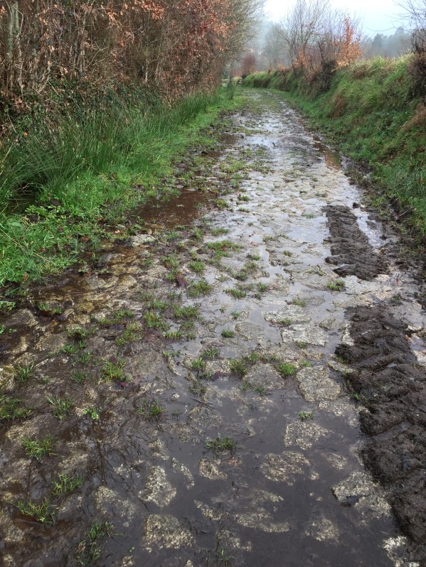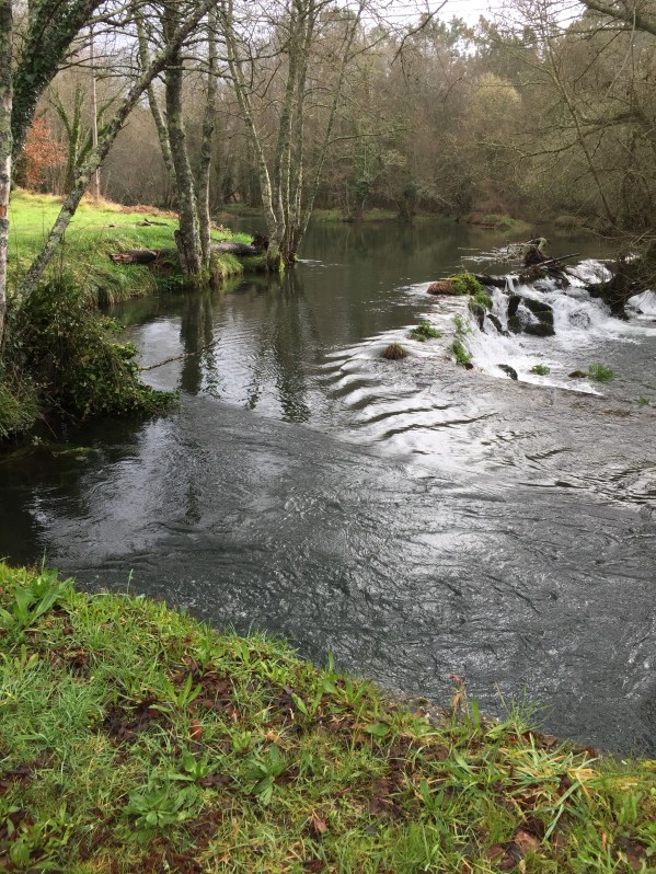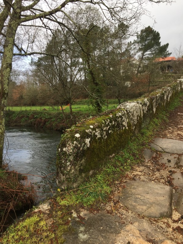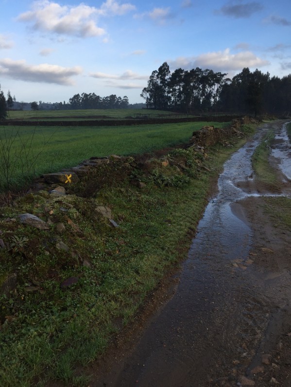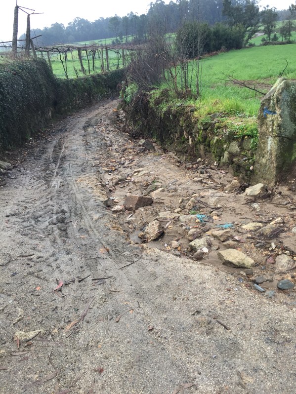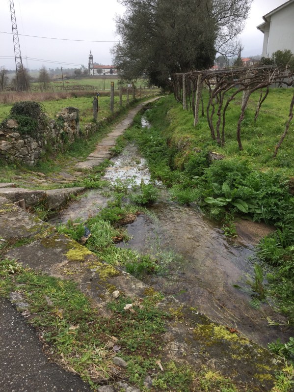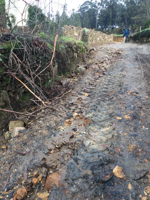 We encountered flooded out Camino roads. The flooding is due to a storm that had just passed through Galicia. I admit we did not know how to traverse the wet road due to thigh high deep water covering our Camino Path on the roads that were next to engorged river and streams.